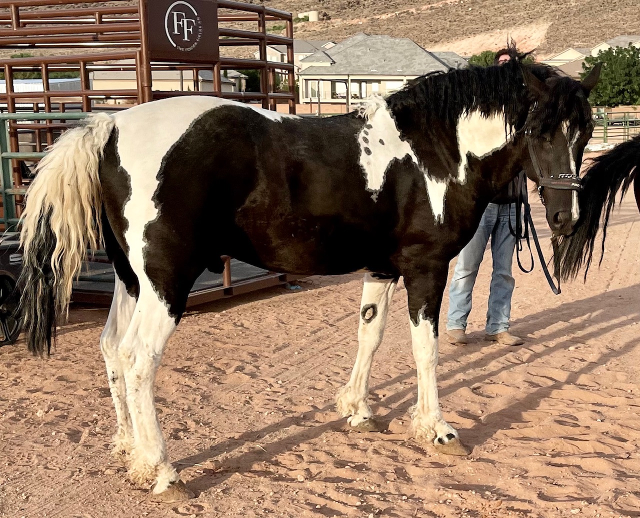 This is a package deal on Angel in foal to a 4 year old, curly black and white stallion named FFCF Boston. He is my favorite Curly MFT Stallion in the world and the best quality I have ever known. He stands at 15.3 hands tall and is only 4 years old. He is massive and super well gaited!! His first foal is on the ground at our farm and she is spectacular. He has been producing extremely friendly and teachable foals so far. We expect this foal to be gorgeous, big easy to train and super well gaited. This pregnancy is vet confirmed and comes with a live foal guarantee as well as a curly guarantee. There is also a 50% chance it will be homozygous for curls in this foal. This is the combination I dreamed of for the past 20 years of breeding Curly MFT’s. If we were not transitioning over to Single-Footers, we would be keeping Angel and her foal. Angel is due between April 29th and May 14th, 2026.